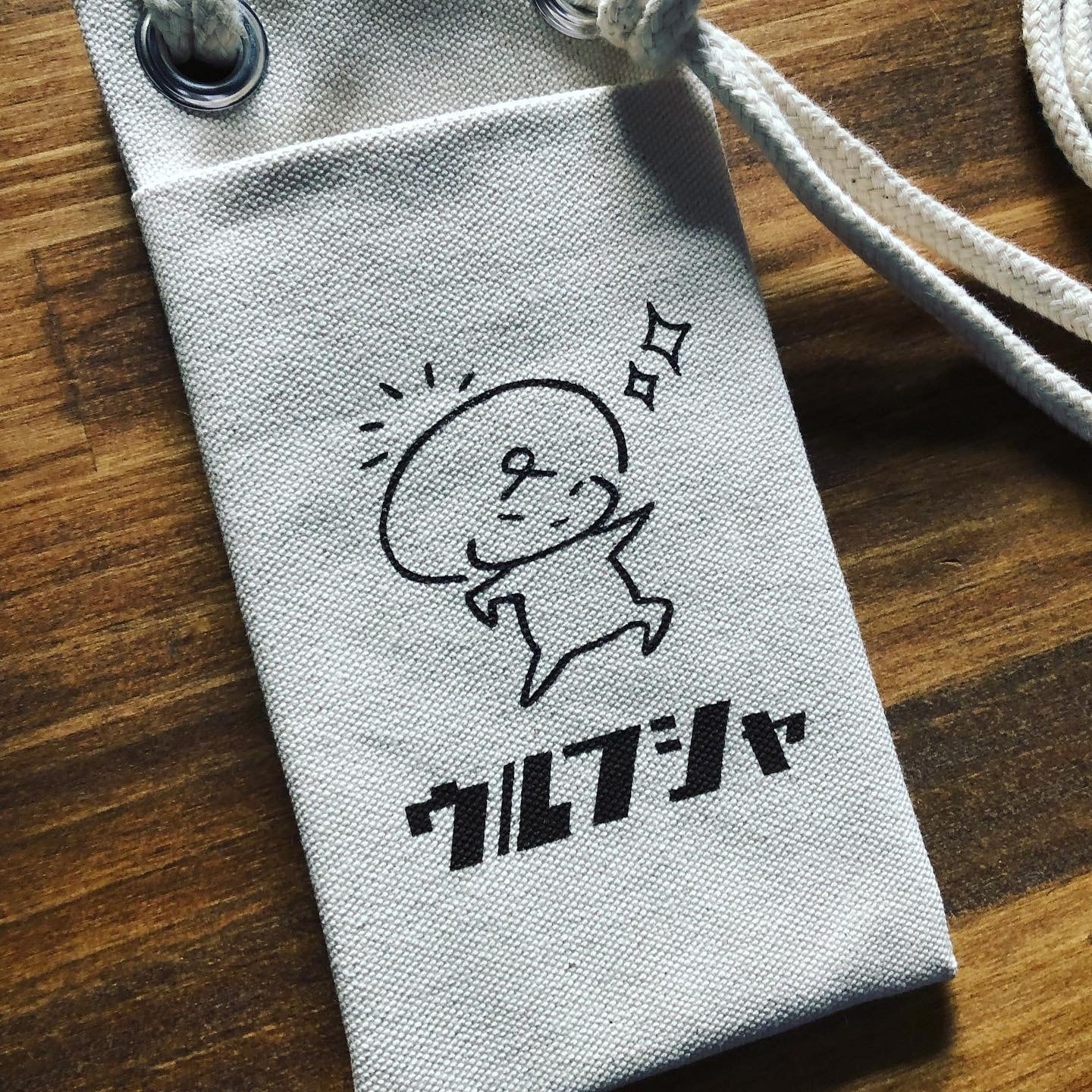 ウルフ舎が作った帆布製の「スマホショルダー」です。横幅10センチですので大きいタイプのスマートフォンもすっぽりと入ります。帆布製なので丈夫に仕上がっています。デザインはウルフくんとぷんデザイン。紐の長さを調節することができます。