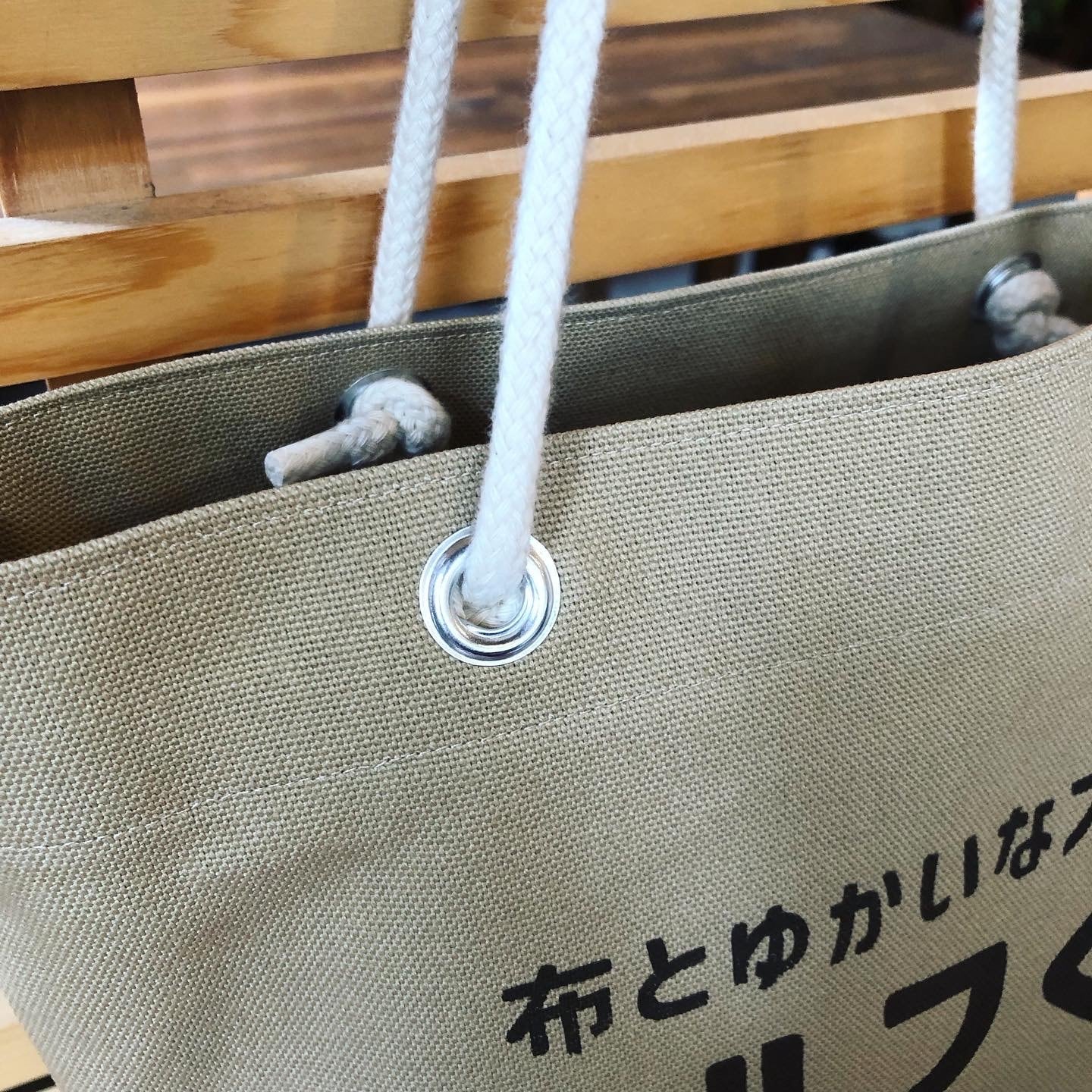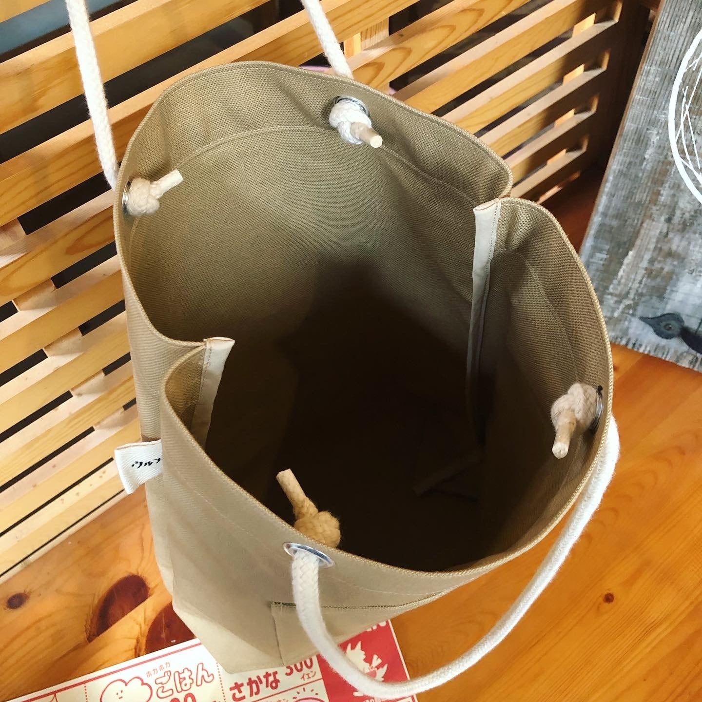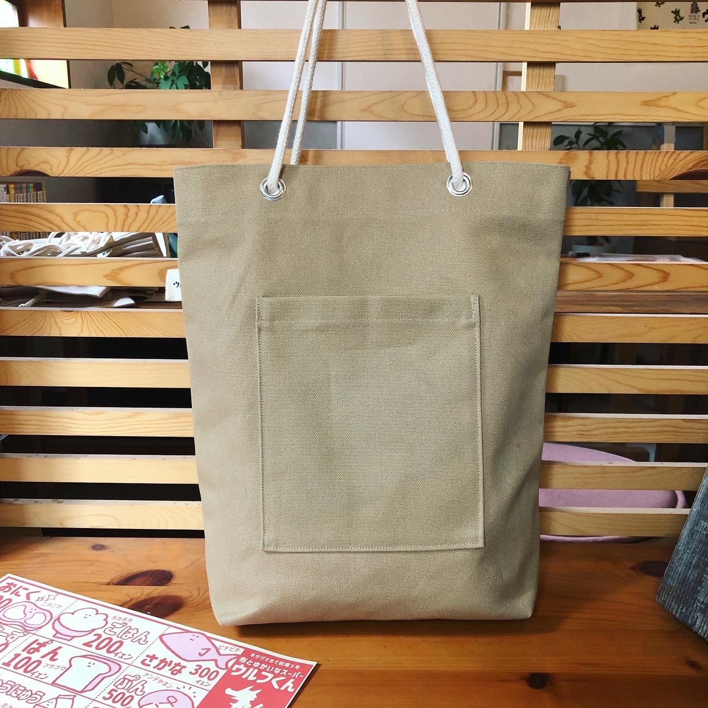 早速お店に行ってみると、ベージュ色の帆布でできた使い勝手が良さそうなお買い物トートバッグが並んでいました。